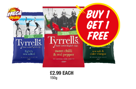 Tyrrells Lightly Salted, Sweet Chilli & red Pepper, Sea Salt & Vinegar - Now Only Buy 1 Get 1 FREE at Premier