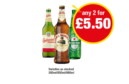 Budweiser, Moretti, Heineken - Any 2 for £5.50 at Premier