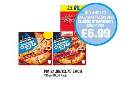 Chicago Town Pizza Takeaway Stuffed Crust Loaded Cheese, Pepperoni, Strawberry Cones - Buy Any 2 Chicago Town Pizas And Classic Strawberry Cones for £6.99 at Premier