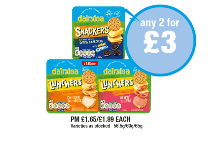 Dairylea Snackers Cheese & Crackers Oreo, Lunchers Chicken 'N' Cheese, Ham 'N' Cheese - Any 2 for £3 at Premier