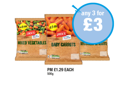 Jack's Mixed Vegetables, Baby Carrots, Brussels Sprouts - Any 3 for £3 at Premier