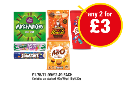 Matchmakers Cool Mint, Rowntrees Bottle Bops, Smarties, Reese's Peanut Butter Disco Lights, Aero Bubbles Orange, Celebrations - Any 2 for £3 at Premier