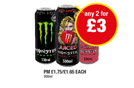 Monster Energy, Juiced Bad Apple, Punch - Any 2 for £3 at Premier