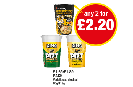 Namdong Chicken Noodles, Pot Noodle Chicken & Mushroom, Original Curry - Any 2 for £2.20 at Premier