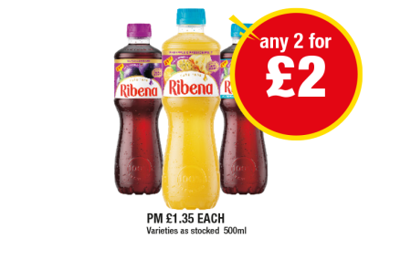 Ribena Blackcurrant, Zero, Pineapple & Passionfruit - Any 2 for £2 at Premier