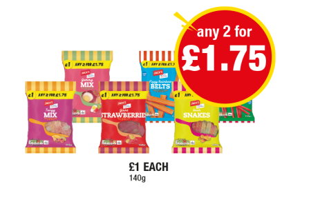 Tangy Mix, Gummy Mix, Giant Strawberries, Fizzy Rainbow Belts, Sour Snakes, Strawberry Pencils - Any 2 for £1.75 at Premier