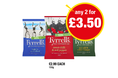Tyrrell's Lightly Salted, Sweet Chilli & Red Pepper, Salt & Cider Vinegar - Any 2 for £3.50 at Premier